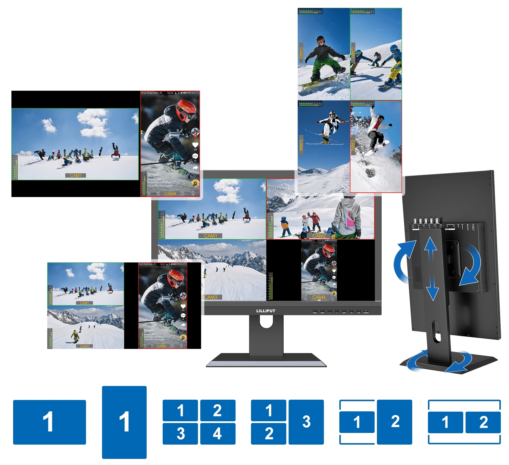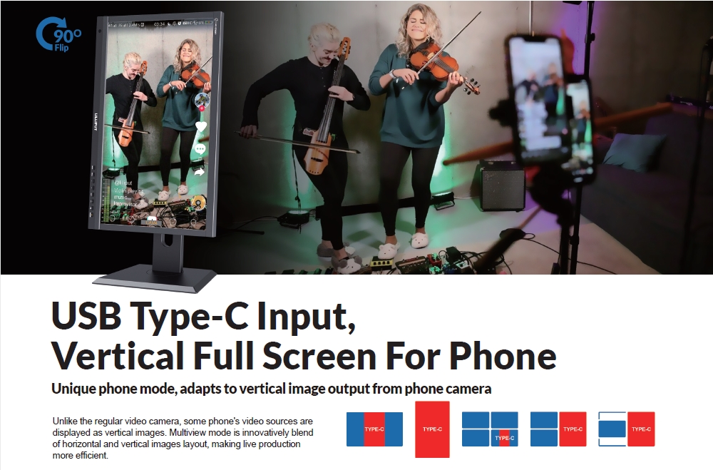 จอภาพมัลติวิวสตรีมสด ขนาด 21.5 นิ้วสำหรับโทรศัพท์มือถือ Android กล้อง DSLR และกล้องวิดีโอ แอพพลิเคชั่นสำหรับการสตรีมสดและกล้องหลายตัว จอภาพสามารถเปลี่ยนแสดงสดได้ถึง 4 อินพุตสัญญาณวิดีโอ
