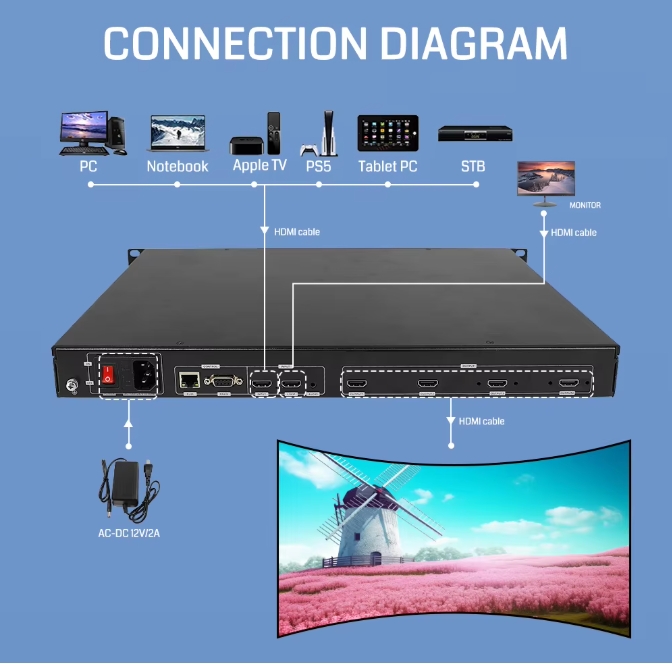 รองรับการประมวลผลแบบเรียลไทม์: สามารถรับสัญญาณ 4K HDMI และประมวลผลสัญญาณความละเอียดสูง (HD) ได้พร้อมกัน 2 ถึง 4 ช่องสัญญาณ