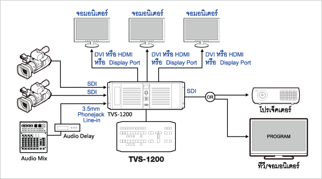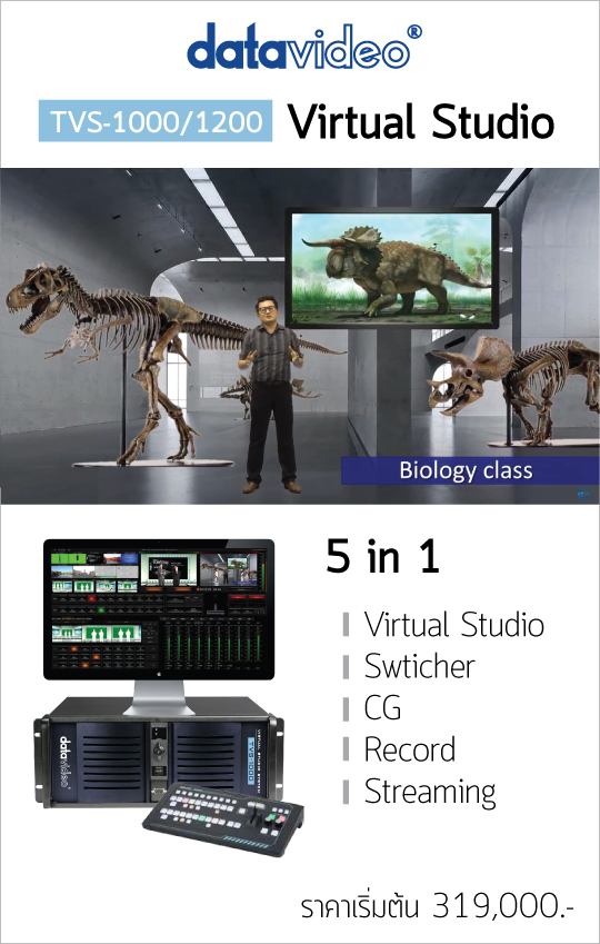 TVS-1200 คือ 5 in 1 Virtual Studio ที่มี 2 SDI Input ประกอบด้วย Virtual Studio, Switcher, CG, Recorder และ Streaming รวมอยู่ในเครื่องเดียว เหมาะสำหรับ บริษัทผลิตสื่อโทรทัศน์, สถานศึกษา, สตูดิโอ และสถานีโทรทัศน์ สร้าง Virtual Cam ได้ถึง 4 มุมกล้องจากกล้องตัวเดียว ด้วยการ crop ภาพ จากมุมกล้องที่ไกลที่สุดโดยไม่สูญเสียคุณภาพในแต่ละมุมกล้อง อีกทั้งยังรองรับการ Pan/Tilt/Zoom ในแต่ละจุดด้วยนอกจากนั้นยังสามารถสร้างฉากหลังเองได้อีกด้วย