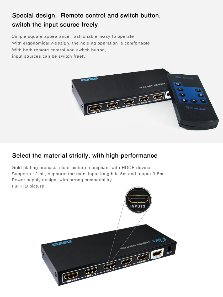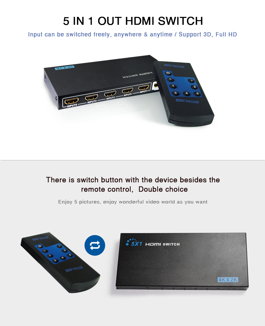 5 ports HDMI switch เป็นอุปกรณ์สลับสัญญาณวีดีโอ เชื่อมต่อกับ monitor or projector, มีปุ่มกดควบคุมที่ตัวเครื่อง และ มาพร้อมกับ remote control
