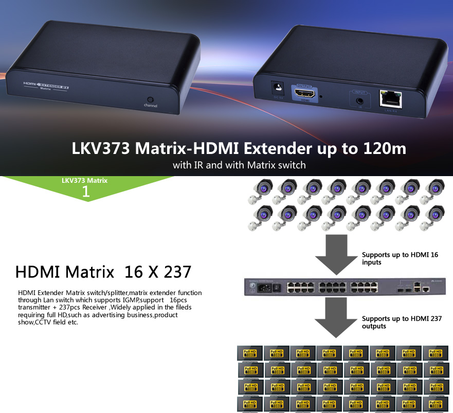 เป็นอุปกรณ์ส่งสัญญาณ HDMI ด้วย Cat5/6 และมีฟังก์ชั่น Extender แบบเมทริกซ์ ผ่านสวิชรองรับอุปกรณ์ส่งถึง 16 ช่อง